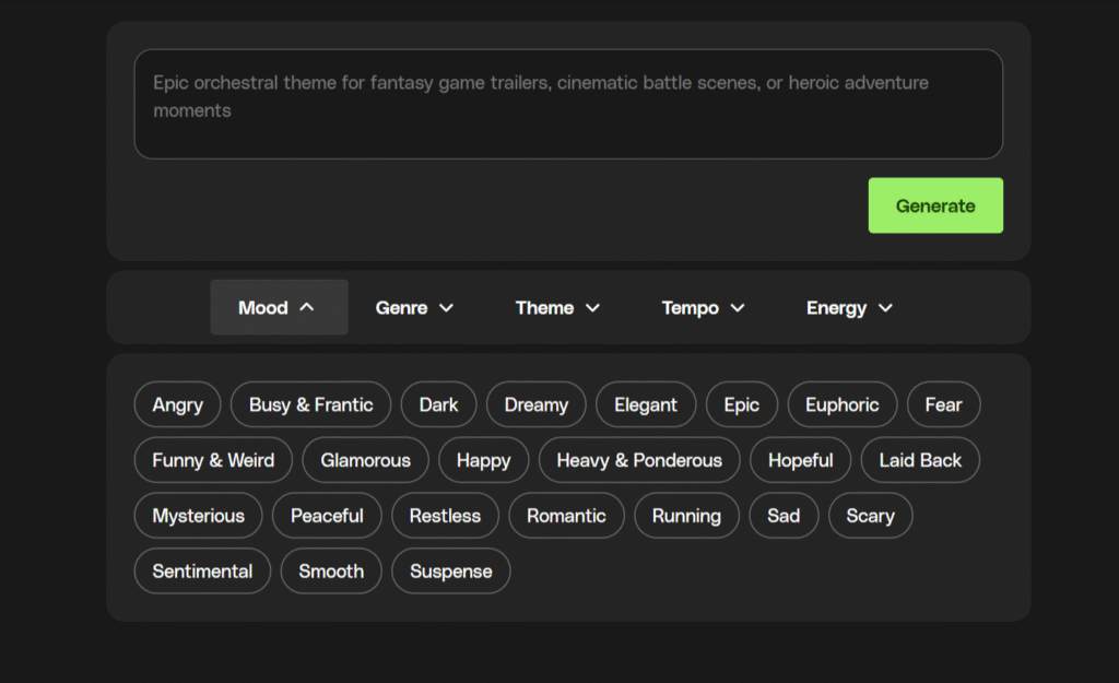 MusicGen is a smart tool from Envato Elements that lets you make your own music just by using words. Instead of searching a huge music library for the right song, you can simply type in what you need, like “calm music for a travel video” or “fast-paced music for a sports ad.” The AI then creates a unique song just for you. This is a game-changer for people who make videos, as it saves a lot of time and money that would normally be spent looking for or buying music.
