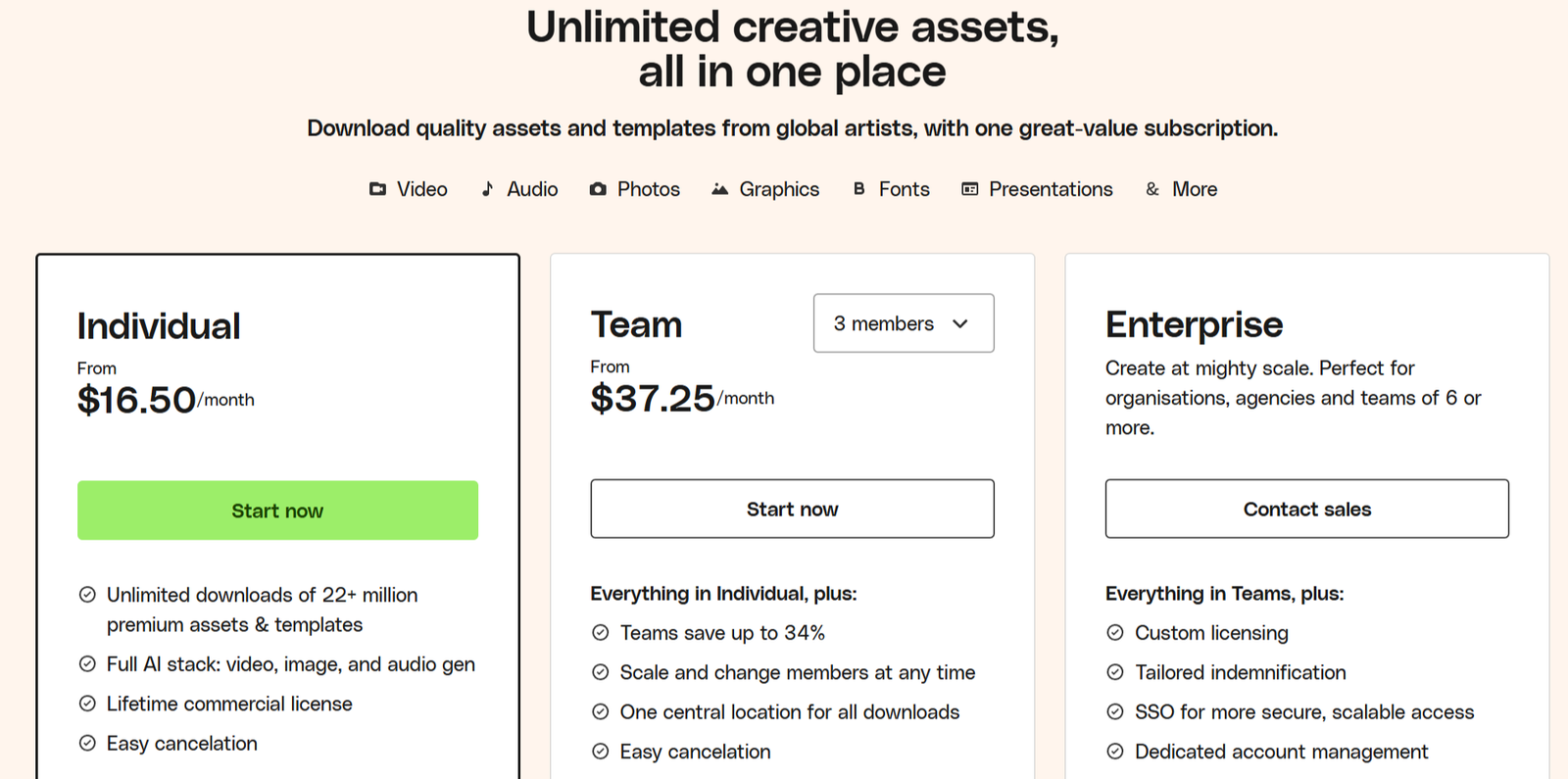 Having a subscription gives you access to unlimited downloads to all of their assets that you can use for commercial use. If you decide to go with an individual plan, it’s 33.00 a month. If you want to buy Envato Elements for a year, the price is 50% off to 16.50 per month.